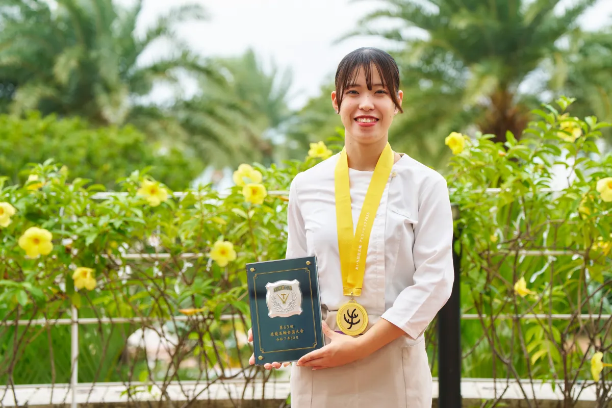 山城さんは、2025年にヒルトン沖縄北谷リゾートに新入社員として入社し、料理飲料部門でのキャリアをスタートさせました。翌年には、学生として技能五輪全国大会に参加し敢闘賞を受賞。その後、2025年に行われた大会で金賞と厚生労働大臣賞を獲得し、名実ともに技術のトップに立ちました。