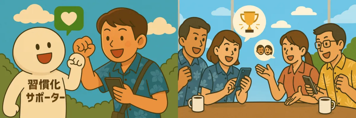 このような問題に対処するため、本実証では「楽しさ × UX × 習慣化理論」を融合させた習慣化支援アプリを活用します。具体的には、豊見城市の職員を対象に、健康行動を記録することで習慣化を促進し、社員同士のエンゲージメントを高めることを目指します。