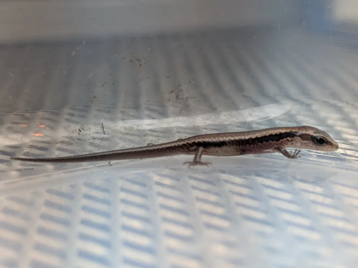 ヨナグニスベトカゲ(学名:Scincella dunan)は、与那国島にのみ自生する固有種で、2022年に新たに記載されたばかり。そのため、生態についての知見はまだ限られています。今回、孵化した幼体は約38mm、体重はわずか0.1gという小ささで、非常に貴重な存在です。