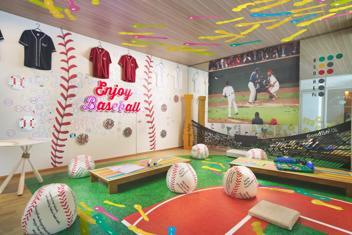 「キャンプ推し活スタジアム」のスタジアムルームは、バットを使用した三脚テーブルから、野球ボール型のクッション、電光掲示板を模した壁面まで、360度全面で野球をイメージした独自の空間を演出しています。滞在者はこの部屋で、仲間と共に推し活を楽しんだり、自由にアイテムを使って遊んだりできるため、より一層ファン同士の交流が促進されます。
