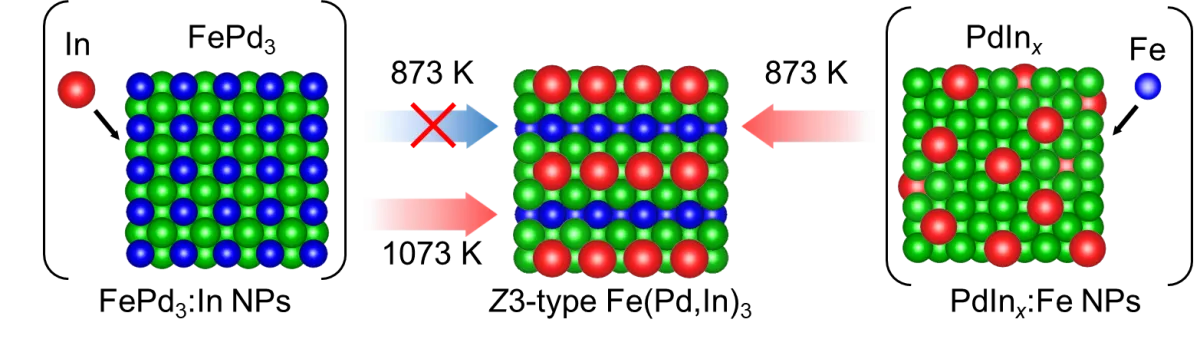 結果として、FePd3:Inナノ粒子は873Kで合金相を形成したのに対し、PdInx:Feナノ粒子は773Kで形成されることが分かりました。この温度差の背後には、FeとInという非相溶な元素ペアの相互作用があることがわかりました。