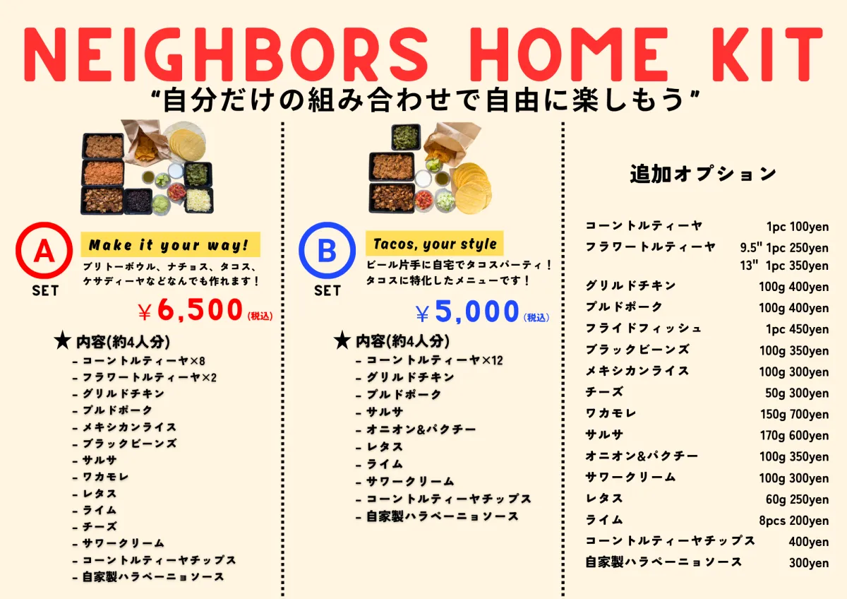 沖縄・南城市に位置する人気店「NEIGHBORS」は、家庭用の本格的なメキシコ料理を楽しめる新しいプランをスタートしました。その名も「NEIGHBORS HOME KIT」。自宅や宿泊先で手軽にタコスやブリトー、ケサディーヤが楽しめるこのキットを使えば、友達や家族との素敵な食体験が広がります。