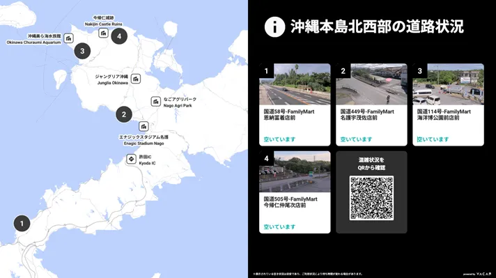 このプロジェクトでは、バカンが提供するAIカメラを利用し、沖縄県北部周辺の混雑状況を4つのポイントでリアルタイムに検知・可視化します。混雑状況は「混雑、やや混雑、空いています」の3つのカテゴリに分類され、那覇空港や沖縄観光案内所に設置されたデジタルサイネージやウェブサイトを通じて広く情報が発信されます。
