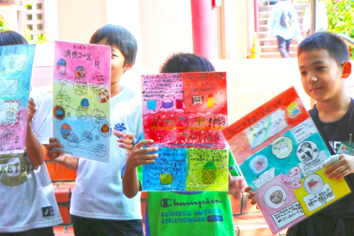 大里南小学校の生徒たちは、地域の象徴であるニライカナイ橋やガンガラーの谷、さらには南城市の美味しいグルメなど、自分たちが愛する「宝物」について熱心に考えました。このプロジェクトを通して、彼らは不安もありましたが、「たくさんの人に見てほしい!」という強い想いを胸に、ポスターを展開しました。その元気な声や笑顔は、周囲の観光客にも明るい影響を与えています。
